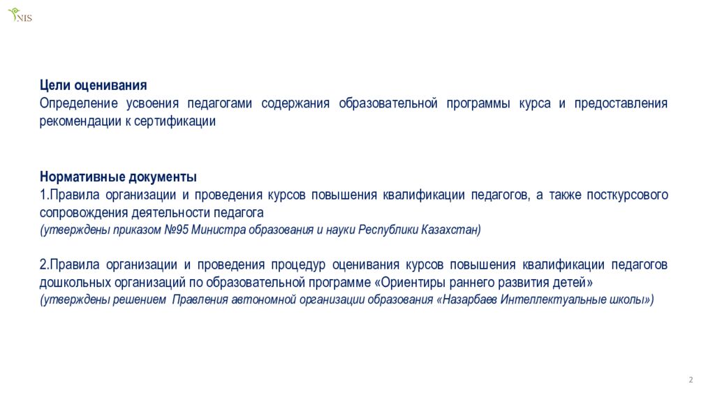 Цели оценивания Определение усвоения педагогами содержания образовательной программы курса и предоставления рекомендации к сертификации Нормативные документы Правила организации и проведения курсов повышения квалификации педагогов, а также посткурсового сопровождения деятельности педагога (утверждены приказом №95 Министра образования и науки Республики Казахстан) Правила организации и проведения процедур оценивания курсов повышения квалификации педагогов дошкольных организаций по образовательной программе «Ориентиры раннего развития детей» (утверждены решением Правления автономной организации образования «Назарбаев Интеллектуальные школы») 2