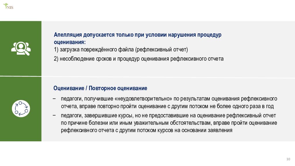 10 педагоги, получившие «неудовлетворительно» по результатам оценивания рефлексивного отчета, вправе повторно пройти оценивание с другим потоком не более одного раза в год педагоги, завершившие курсы, но не предоставившие на оценивание рефлексивный отчет по причине болезни или иным уважительным обстоятельствам, вправе пройти оценивание рефлексивного отчета с другим потоком курсов на основании заявления Апелляция допускается только при условии нарушения процедур оценивания: Оценивание / Повторное оценивание загрузка повреждённого файла (рефлексивный отчет) несоблюдение сроков и процедур оценивания рефлексивного отчета