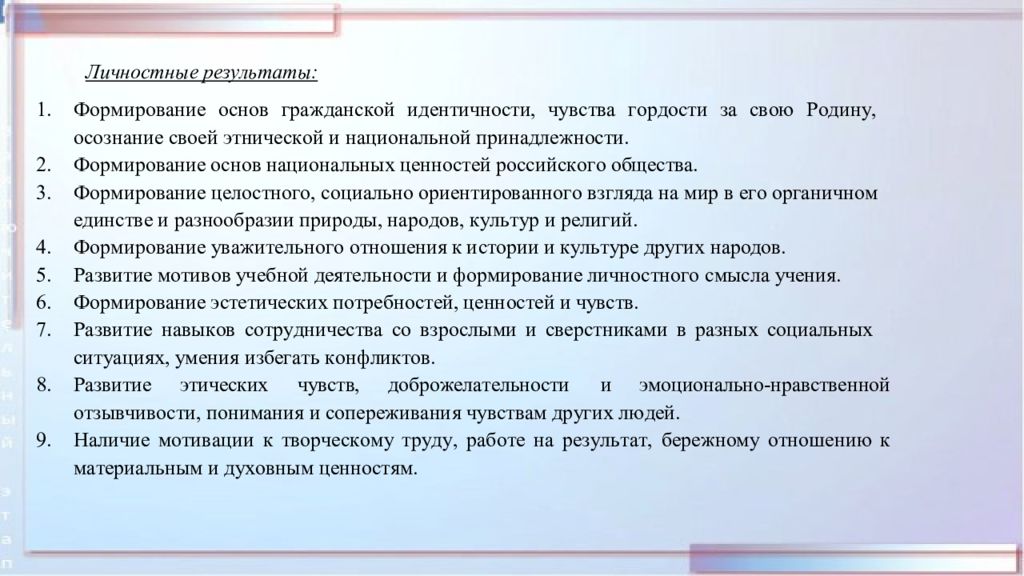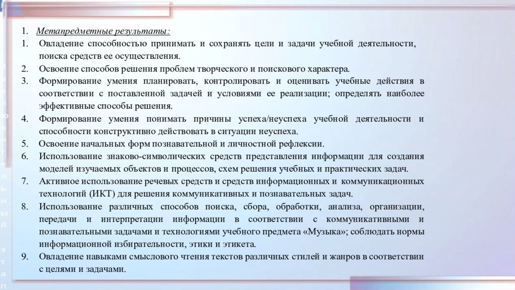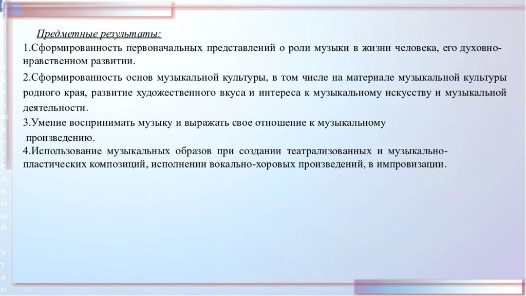 Предметные результаты: 1.Сформированность первоначальных представлений о роли музыки в жизни человека, его духовно-нравственном развитии. 2.Сформированность основ музыкальной культуры, в том числе на материале музыкальной культуры родного края, развитие художественного вкуса и интереса к музыкальному искусству и музыкальной деятельности. 3.Умение воспринимать музыку и выражать свое отношение к музыкальному произведению. 4.Использование музыкальных образов при создании театрализованных и музыкально- пластических композиций, исполнении вокально-хоровых произведений, в импровизации.