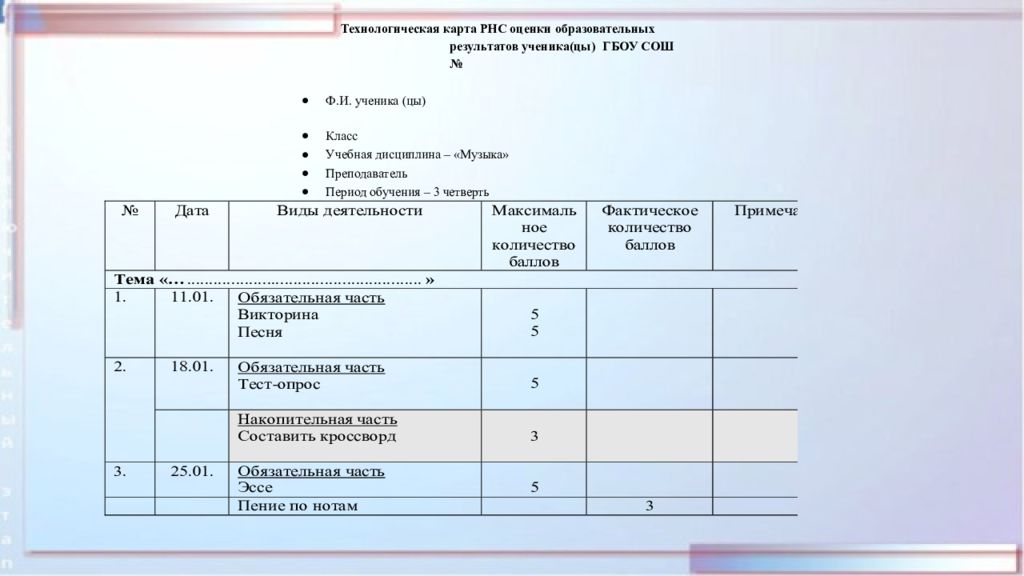 Технологическая карта РНС оценки образовательных результатов ученика( цы ) ГБОУ СОШ № Ф.И. ученика ( цы ) Класс Учебная дисциплина – «Музыка» Преподаватель Период обучения – 3 четверть