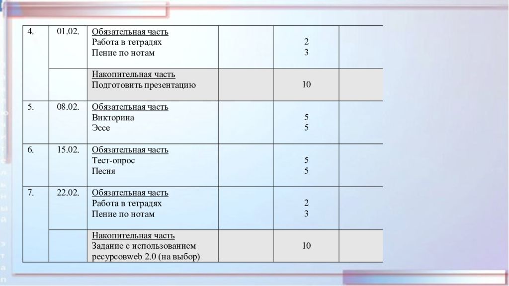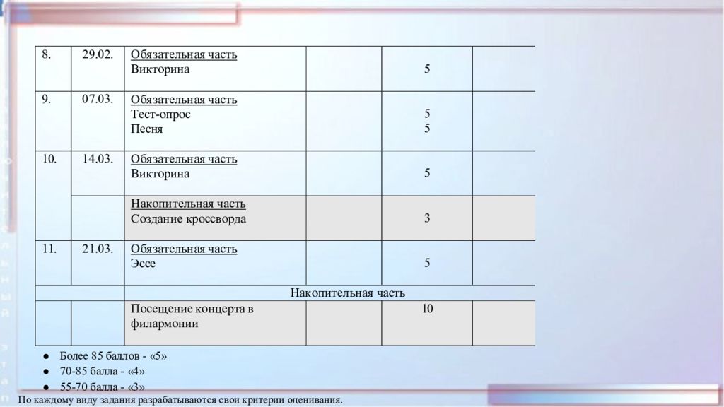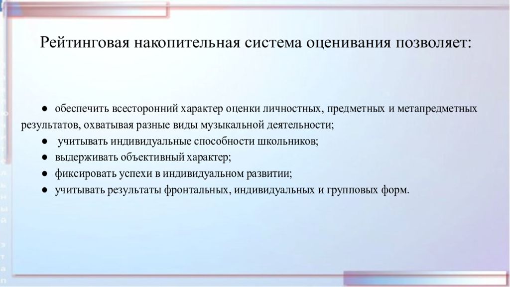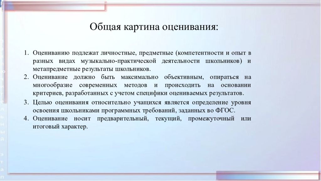 Общая картина оценивания: Оцениванию подлежат личностные, предметные (компетентности и опыт в разных видах музыкально-практической деятельности школьников) и метапредметные результаты школьников. Оценивание должно быть максимально объективным, опираться на многообразие современных методов и происходить на основании критериев, разработанных с учетом специфики оцениваемых результатов. Целью оценивания относительно учащихся является определение уровня освоения школьниками программных требований, заданных во ФГОС. Оценивание носит предварительный, текущий, промежуточный или итоговый характер.