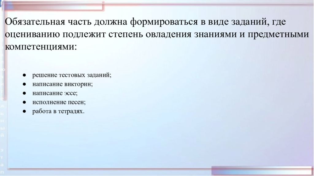 Обязательная часть должна формироваться в виде заданий, где оцениванию подлежит степень овладения знаниями и предметными компетенциями: