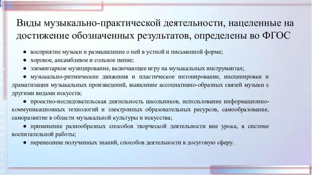 Виды музыкально-практической деятельности, нацеленные на достижение обозначенных результатов, определены во ФГОС