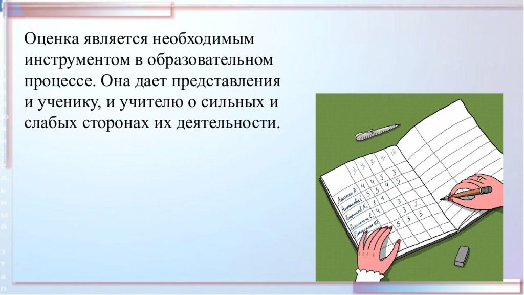 Оценка является необходимым инструментом в образовательном процессе. Она дает представления и ученику, и учителю о сильных и слабых сторонах их деятельности.