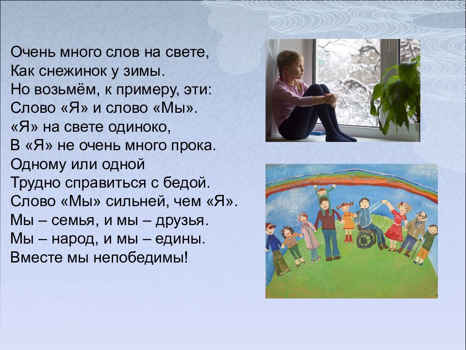 Очень много слов на свете, Как снежинок у зимы. Но возьмём, к примеру, эти: Слово «Я» и слово «Мы». «Я» на свете одиноко, В «Я» не очень много прока. Одному или одной Трудно справиться с бедой. Слово «Мы» сильней, чем «Я». Мы – семья, и мы – друзья. Мы – народ, и мы – едины. Вместе мы непобедимы!
