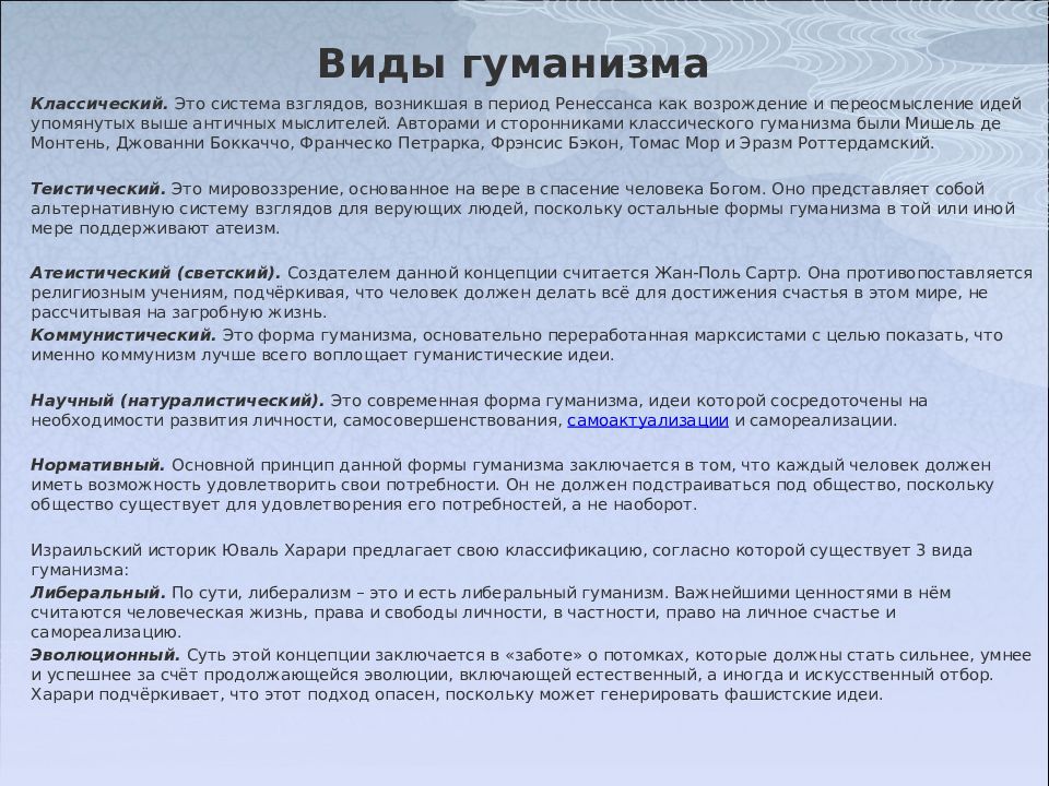 Классический. Это система взглядов, возникшая в период Ренессанса как возрождение и переосмысление идей упомянутых выше античных мыслителей. Авторами и сторонниками классического гуманизма были Мишель де Монтень, Джованни Боккаччо, Франческо Петрарка, Фрэнсис Бэкон, Томас Мор и Эразм Роттердамский. Теистический. Это мировоззрение, основанное на вере в спасение человека Богом. Оно представляет собой альтернативную систему взглядов для верующих людей, поскольку остальные формы гуманизма в той или иной мере поддерживают атеизм. Атеистический (светский). Создателем данной концепции считается Жан-Поль Сартр. Она противопоставляется религиозным учениям, подчёркивая, что человек должен делать всё для достижения счастья в этом мире, не рассчитывая на загробную жизнь. Коммунистический. Это форма гуманизма, основательно переработанная марксистами с целью показать, что именно коммунизм лучше всего воплощает гуманистические идеи. Научный (натуралистический). Это современная форма гуманизма, идеи которой сосредоточены на необходимости развития личности, самосовершенствования, самоактуализации и самореализации. Нормативный. Основной принцип данной формы гуманизма заключается в том, что каждый человек должен иметь возможность удовлетворить свои потребности. Он не должен подстраиваться под общество, поскольку общество существует для удовлетворения его потребностей, а не наоборот. Израильский историк Юваль Харари предлагает свою классификацию, согласно которой существует 3 вида гуманизма: Либеральный. По сути, либерализм – это и есть либеральный гуманизм. Важнейшими ценностями в нём считаются человеческая жизнь, права и свободы личности, в частности, право на личное счастье и самореализацию. Эволюционный. Суть этой концепции заключается в «заботе» о потомках, которые должны стать сильнее, умнее и успешнее за счёт продолжающейся эволюции, включающей естественный, а иногда и искусственный отбор. Харари подчёркивает, что этот подход опасен, поскольку может генерировать фашистские идеи.