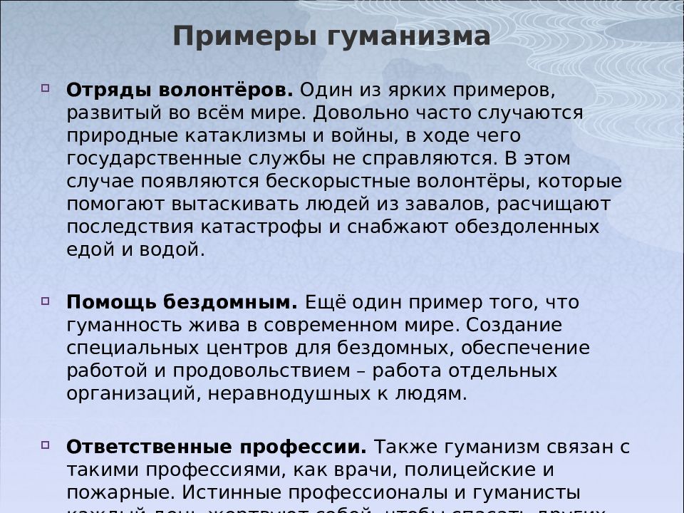 Отряды волонтёров. Один из ярких примеров, развитый во всём мире. Довольно часто случаются природные катаклизмы и войны, в ходе чего государственные службы не справляются. В этом случае появляются бескорыстные волонтёры, которые помогают вытаскивать людей из завалов, расчищают последствия катастрофы и снабжают обездоленных едой и водой. Помощь бездомным. Ещё один пример того, что гуманность жива в современном мире. Создание специальных центров для бездомных, обеспечение работой и продовольствием – работа отдельных организаций, неравнодушных к людям. Ответственные профессии. Также гуманизм связан с такими профессиями, как врачи, полицейские и пожарные. Истинные профессионалы и гуманисты каждый день жертвуют собой, чтобы спасать других людей.