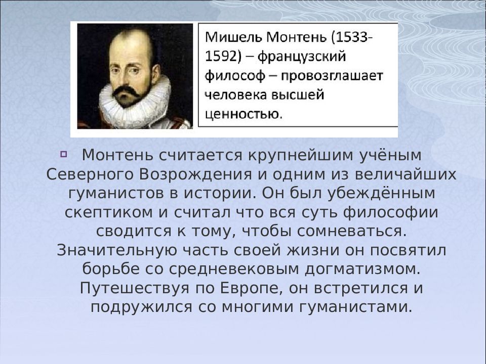 Монтень считается крупнейшим учёным Северного Возрождения и одним из величайших гуманистов в истории. Он был убеждённым скептиком и считал что вся суть философии сводится к тому, чтобы сомневаться. Значительную часть своей жизни он посвятил борьбе со средневековым догматизмом. Путешествуя по Европе, он встретился и подружился со многими гуманистами.