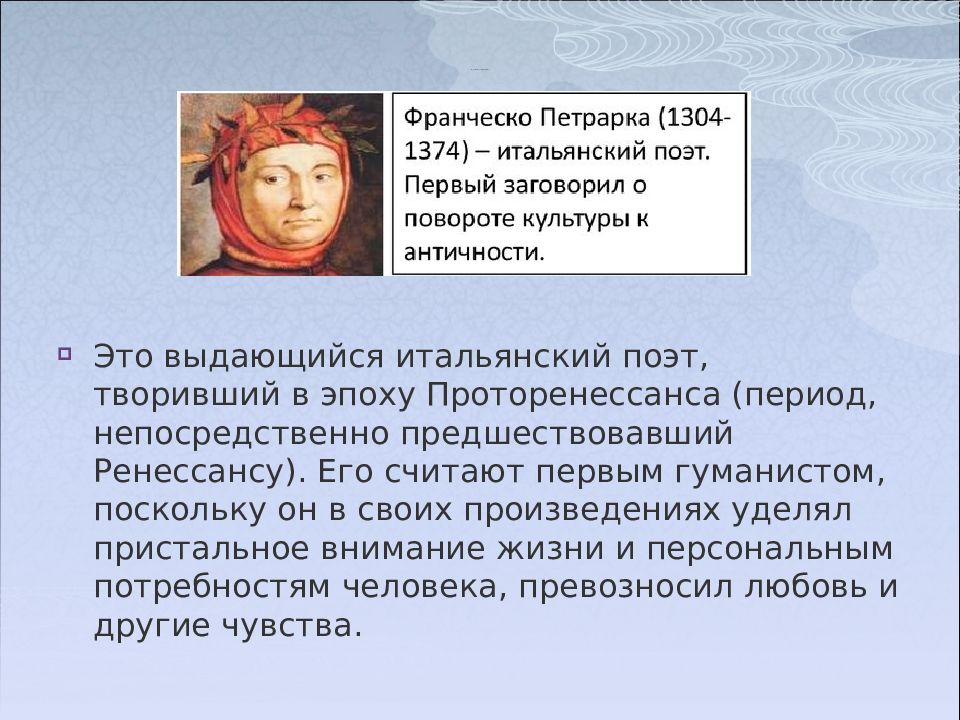 Это выдающийся итальянский поэт, творивший в эпоху Проторенессанса (период, непосредственно предшествовавший Ренессансу). Его считают первым гуманистом, поскольку он в своих произведениях уделял пристальное внимание жизни и персональным потребностям человека, превозносил любовь и другие чувства.