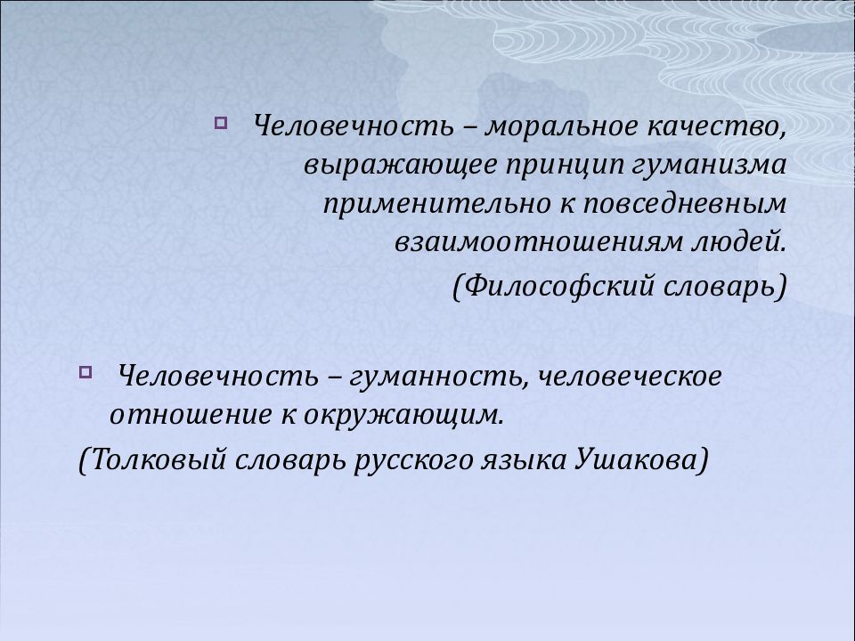 Человечность – моральное качество, выражающее принцип гуманизма применительно к повседневным взаимоотношениям людей. (Философский словарь) Человечность – гуманность, человеческое отношение к окружающим. (Толковый словарь русского языка Ушакова)