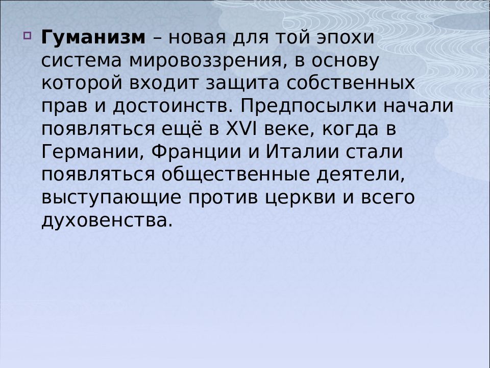 Гуманизм – новая для той эпохи система мировоззрения, в основу которой входит защита собственных прав и достоинств. Предпосылки начали появляться ещё в XVI веке, когда в Германии, Франции и Италии стали появляться общественные деятели, выступающие против церкви и всего духовенства.