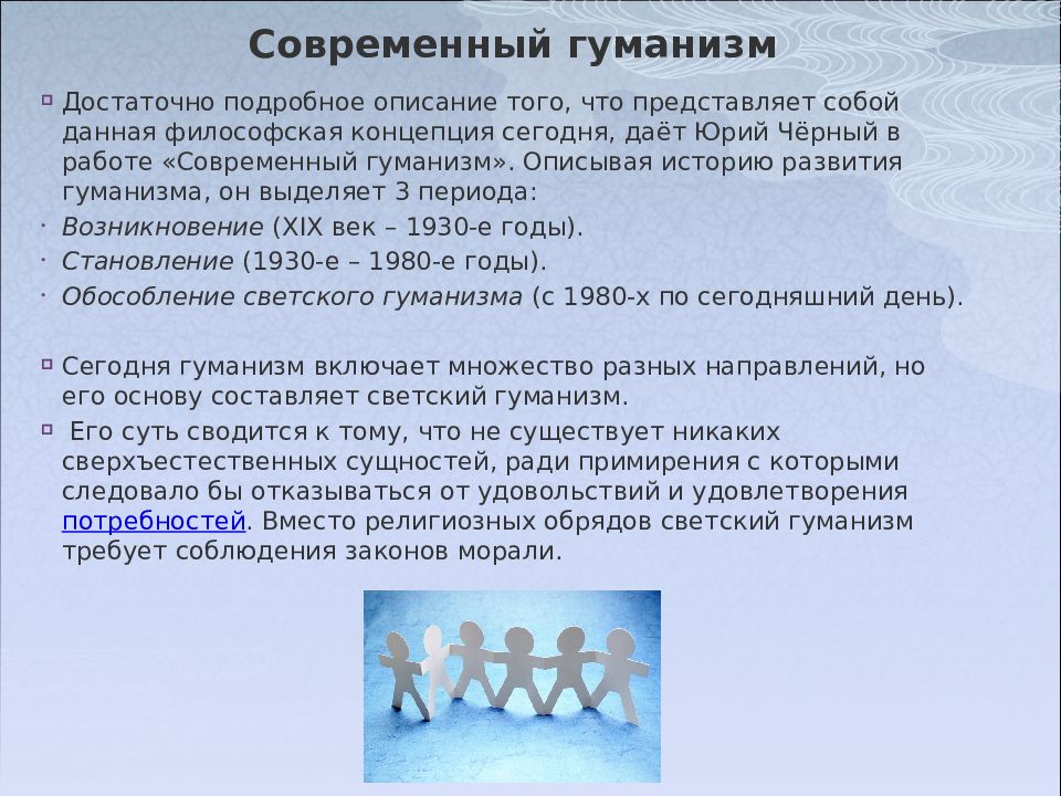 Достаточно подробное описание того, что представляет собой данная философская концепция сегодня, даёт Юрий Чёрный в работе «Современный гуманизм». Описывая историю развития гуманизма, он выделяет 3 периода: Возникновение (XIX век – 1930-е годы). Становление (1930-е – 1980-е годы). Обособление светского гуманизма (с 1980-х по сегодняшний день). Сегодня гуманизм включает множество разных направлений, но его основу составляет светский гуманизм. Его суть сводится к тому, что не существует никаких сверхъестественных сущностей, ради примирения с которыми следовало бы отказываться от удовольствий и удовлетворения потребностей. Вместо религиозных обрядов светский гуманизм требует соблюдения законов морали.