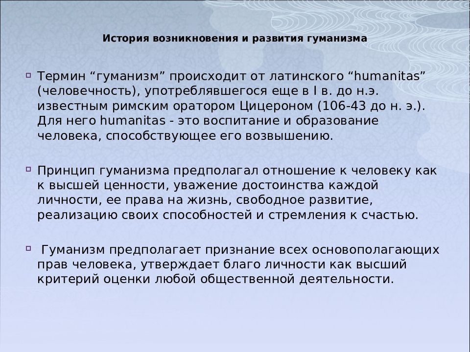 Термин “гуманизм” происходит от латинского “ humanitas ” (человечность), употреблявшегося еще в I в. до н.э. известным римским оратором Цицероном (106-43 до н. э.). Для него humanitas - это воспитание и образование человека, способствующее его возвышению. Принцип гуманизма предполагал отношение к человеку как к высшей ценности, уважение достоинства каждой личности, ее права на жизнь, свободное развитие, реализацию своих способностей и стремления к счастью. Гуманизм предполагает признание всех основополагающих прав человека, утверждает благо личности как высший критерий оценки любой общественной деятельности.