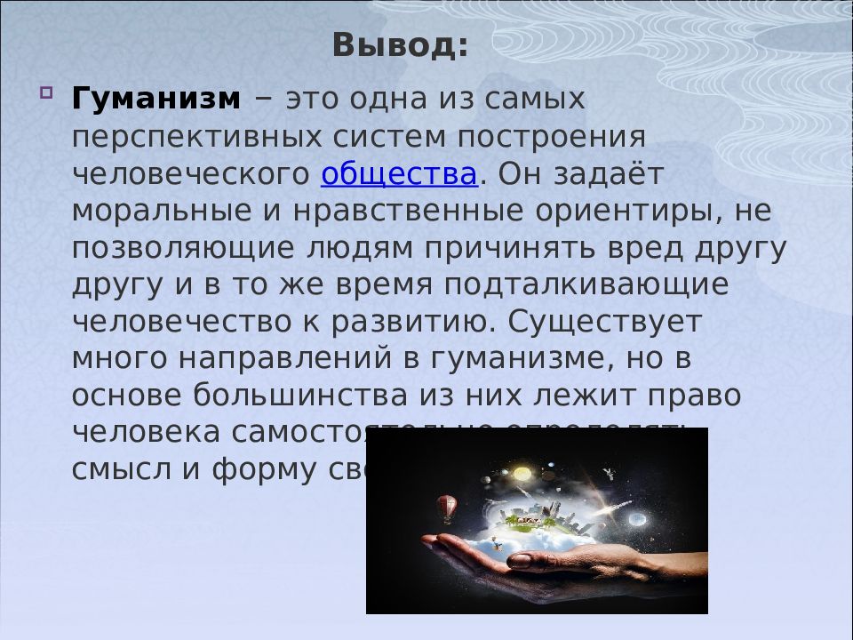 Гуманизм – это одна из самых перспективных систем построения человеческого общества. Он задаёт моральные и нравственные ориентиры, не позволяющие людям причинять вред другу другу и в то же время подталкивающие человечество к развитию. Существует много направлений в гуманизме, но в основе большинства из них лежит право человека самостоятельно определять смысл и форму своей жизни.