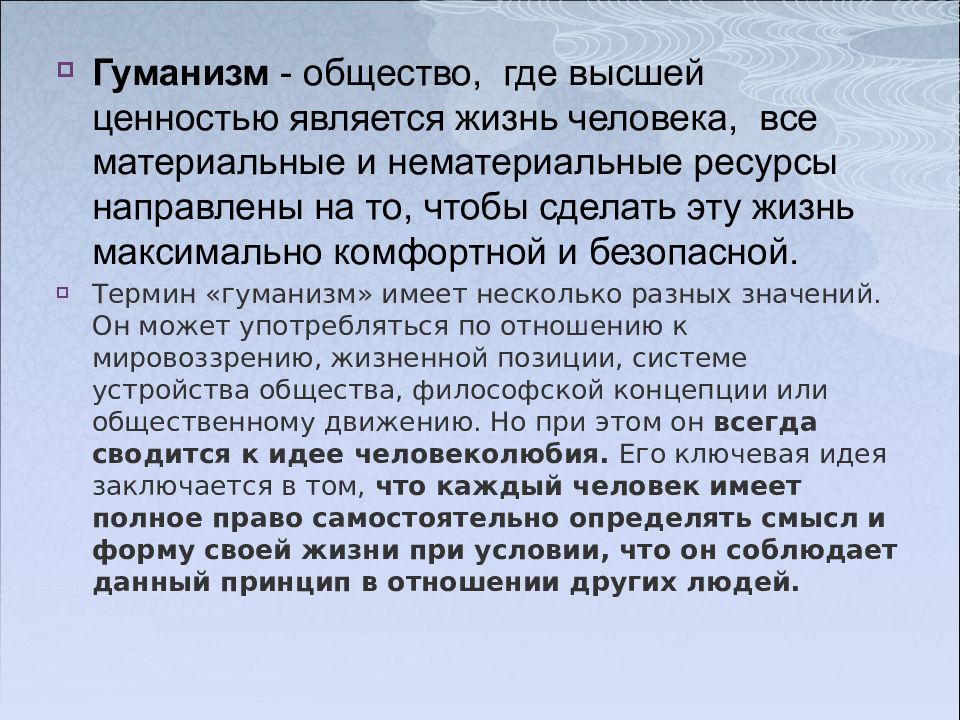 Гуманизм - общество, где высшей ценностью является жизнь человека, все материальные и нематериальные ресурсы направлены на то, чтобы сделать эту жизнь максимально комфортной и безопасной. Термин «гуманизм» имеет несколько разных значений. Он может употребляться по отношению к мировоззрению, жизненной позиции, системе устройства общества, философской концепции или общественному движению. Но при этом он всегда сводится к идее человеколюбия. Его ключевая идея заключается в том, что каждый человек имеет полное право самостоятельно определять смысл и форму своей жизни при условии, что он соблюдает данный принцип в отношении других людей.