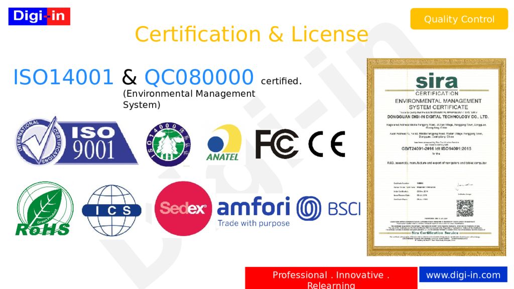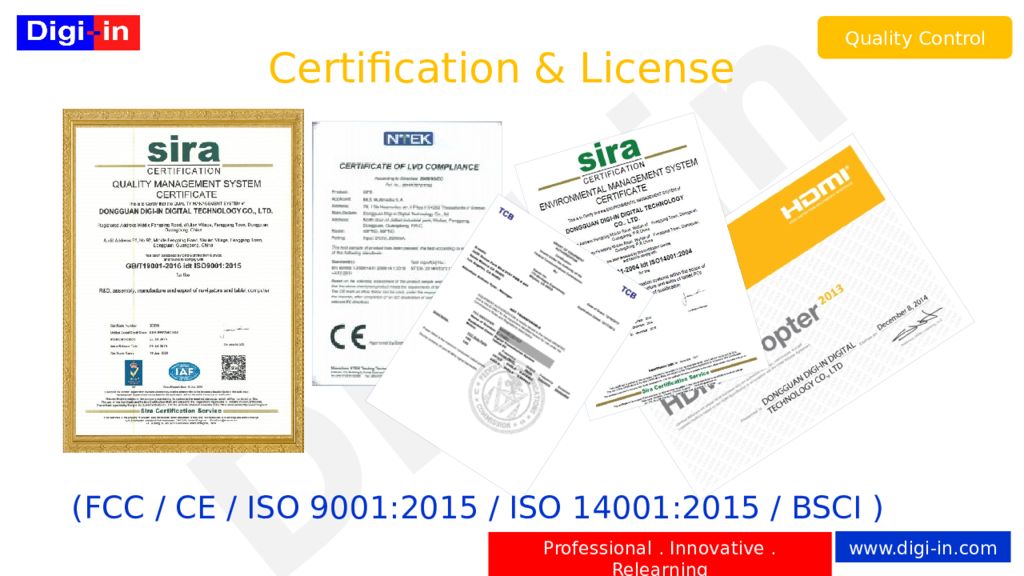 Certification & License (FCC / CE / ISO 9001:2015 / ISO 14001:2015 / BSCI ) Quality Control