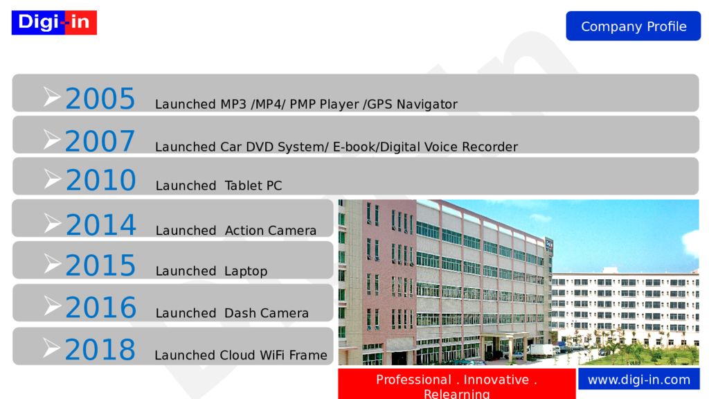 2005 Launched MP3 /MP4/ PMP Player /GPS Navigator 2015 Launched Laptop 2016 Launched Dash Camera 2007 Launched Car DVD System/ E-book/Digital Voice Recorder 2010 Launched Tablet PC 2014 Launched Action Camera 2018 Launched Cloud WiFi Frame Company Profile