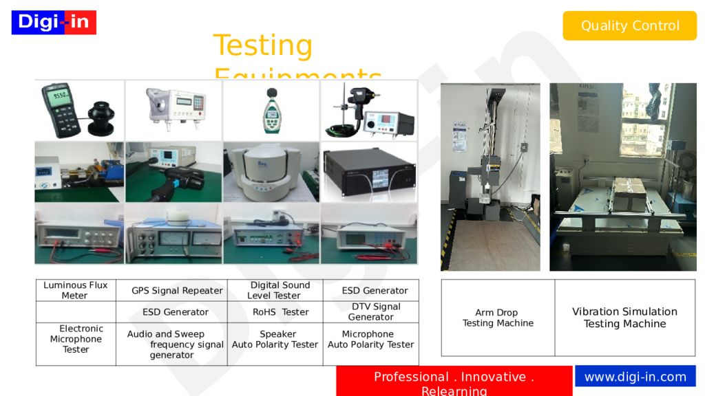 Testing Equipments Arm Drop Testing Machine Vibration Simulation Testing Machine Luminous Flux Meter GPS Signal Repeater Digital Sound Level Tester ESD Generator ESD Generator RoHS Tester DTV Signal Generator Electronic Microphone Tester Audio and Sweep frequency signal generator Speaker Auto Polarity Tester Microphone Auto Polarity Tester Quality Control