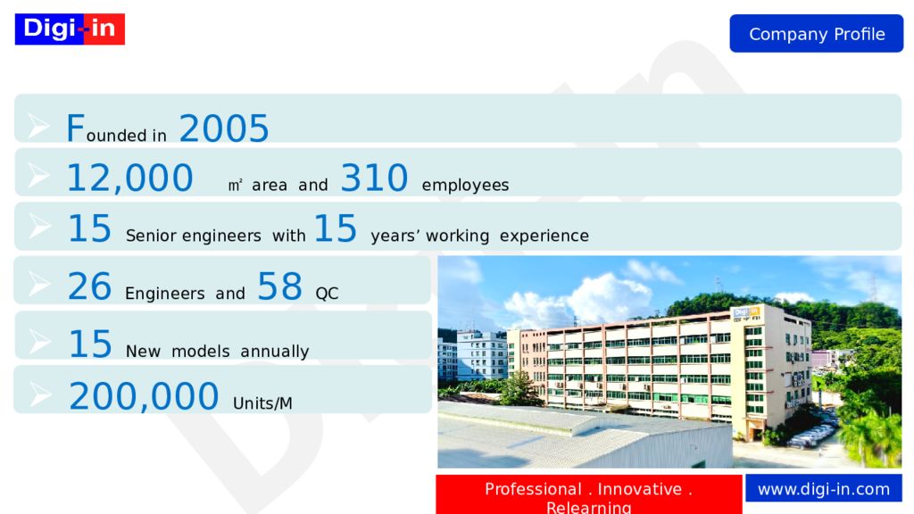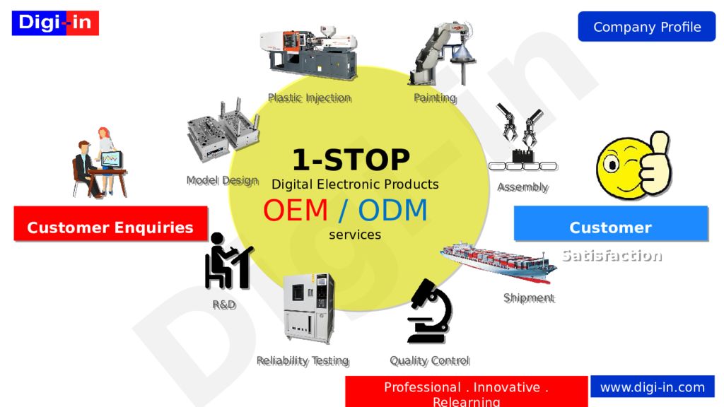 Customer E nquiries R&D Model Design Plastic Injection Painting Assembly Quality Control R eliability Testing Shipment Customer S atisfaction 1-STOP Digital E lectronic P roducts OEM / ODM services Company Profile