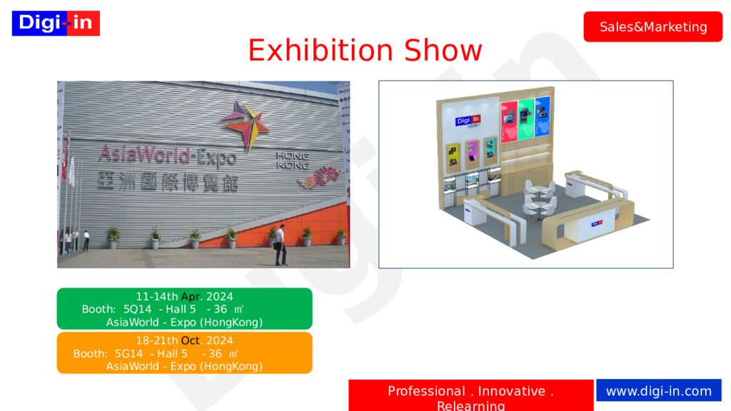 Exhibition Show 18-21th Oct. 202 4 Booth: 5G14 - Hall 5 - 36 ㎡ AsiaWorld - Expo (HongKong) 2023 11-14 th Apr. 202 4 Booth: 5Q14 - Hall 5 - 36 ㎡ AsiaWorld - Expo (HongKong) Sales&Marketing