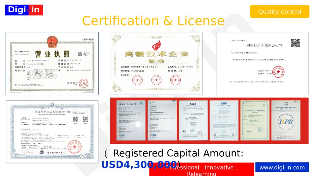 Certification & License ( Registered Capital Amount: USD4,300,000 ) Quality Control