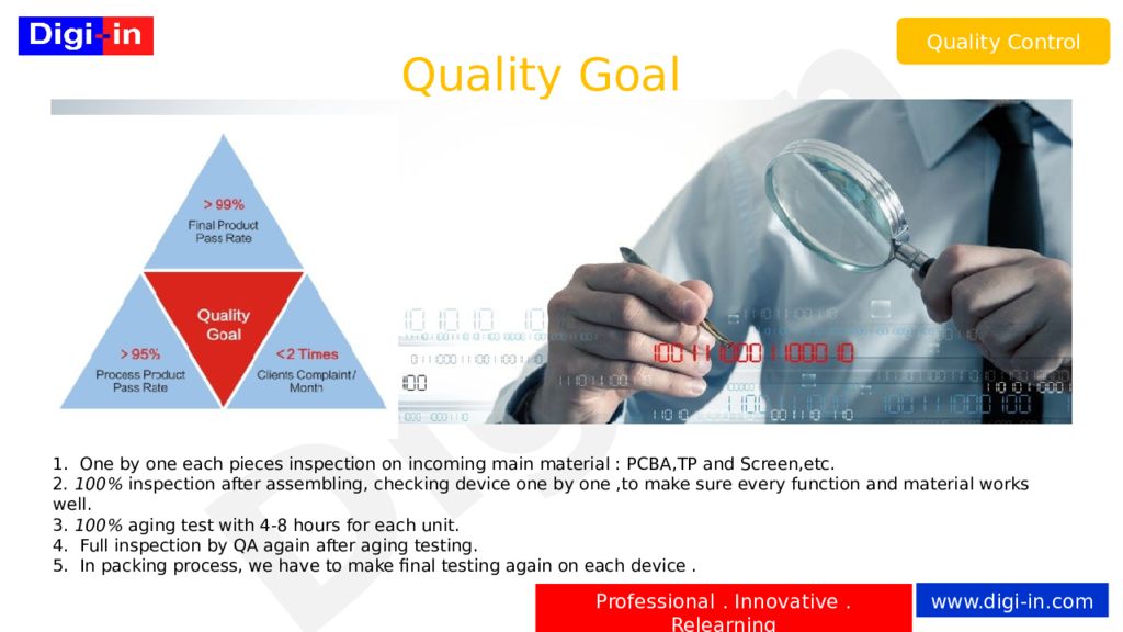 Quality Goal 1. One by one each pieces inspection on incoming main material : PCBA,TP and Screen,etc. 2. 100% inspection after assembling, checking device one by one,to make sure every function and material works well. 3. 100% aging test with 4-8 hours for each unit. 4. Full inspection by QA again after aging testing. 5. In packing process, we have to make final testing again on each device. Quality Control
