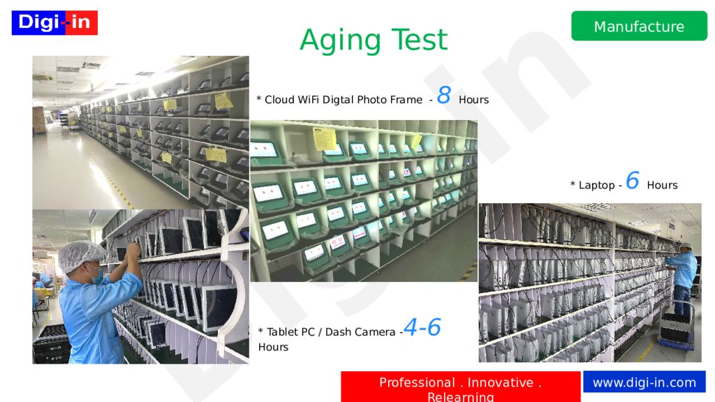 Aging Test * Tablet PC / Dash Camera - 4-6 Hours * Laptop - 6 Hours * Cloud WiFi D igtal P hoto F rame - 8 Hours Manufacture