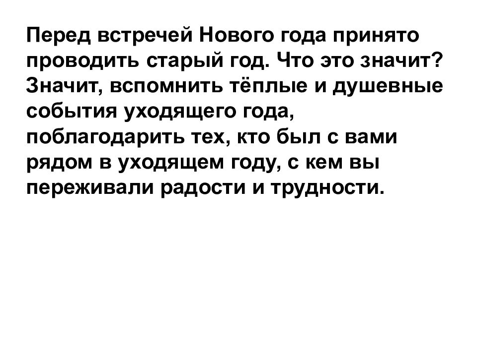 Перед встречей Нового года принято проводить старый год. Что это значит? Значит, вспомнить тёплые и душевные события уходящего года, поблагодарить тех, кто был с вами рядом в уходящем году, с кем вы переживали радости и трудности.