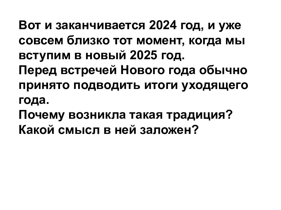 Вот и заканчивается 2024 год, и уже совсем близко тот момент, когда мы вступим в новый 2025 год. Перед встречей Нового года обычно принято подводить итоги уходящего года. Почему возникла такая традиция? Какой смысл в ней заложен?