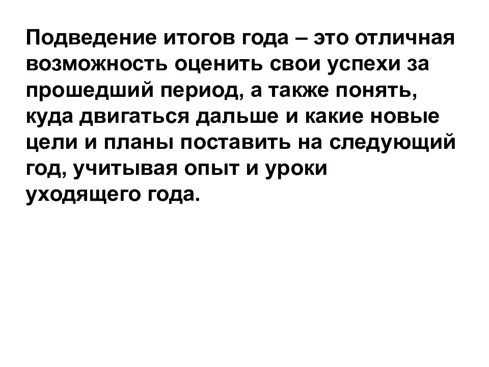 Подведение итогов года – это отличная возможность оценить свои успехи за прошедший период, а также понять, куда двигаться дальше и какие новые цели и планы поставить на следующий год, учитывая опыт и уроки уходящего года.