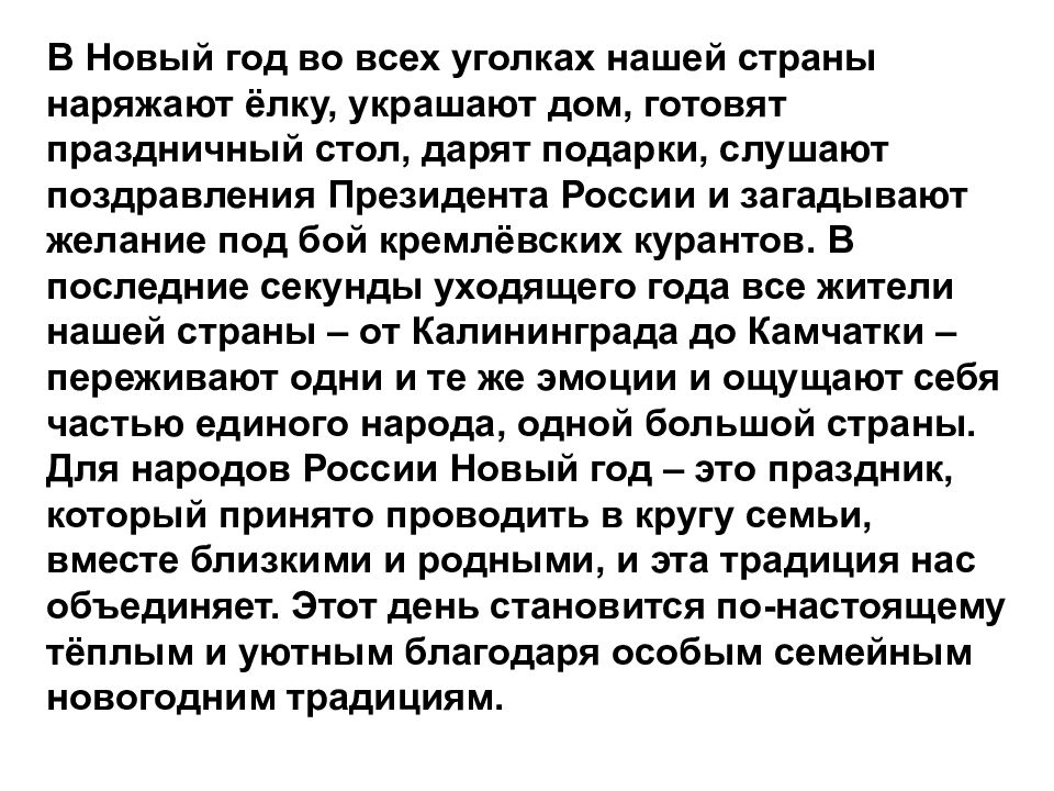 В Новый год во всех уголках нашей страны наряжают ёлку, украшают дом, готовят праздничный стол, дарят подарки, слушают поздравления Президента России и загадывают желание под бой кремлёвских курантов. В последние секунды уходящего года все жители нашей страны – от Калининграда до Камчатки – переживают одни и те же эмоции и ощущают себя частью единого народа, одной большой страны. Для народов России Новый год – это праздник, который принято проводить в кругу семьи, вместе близкими и родными, и эта традиция нас объединяет. Этот день становится по-настоящему тёплым и уютным благодаря особым семейным новогодним традициям.
