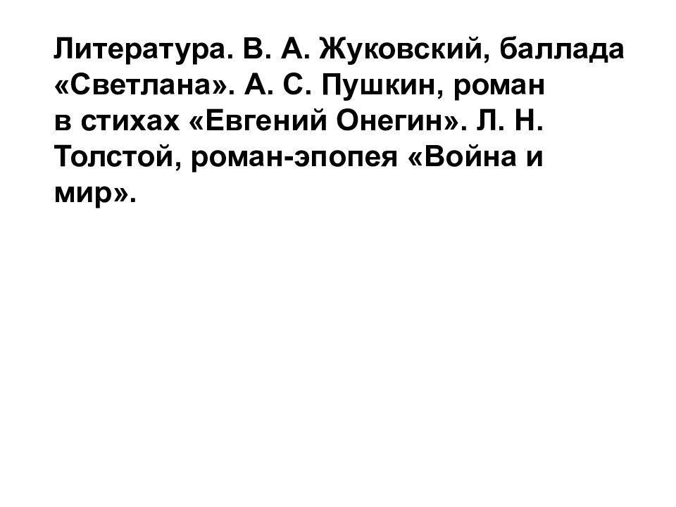 Литература. В. А. Жуковский, баллада «Светлана». А. С. Пушкин, роман в стихах «Евгений Онегин». Л. Н. Толстой, роман-эпопея «Война и мир».