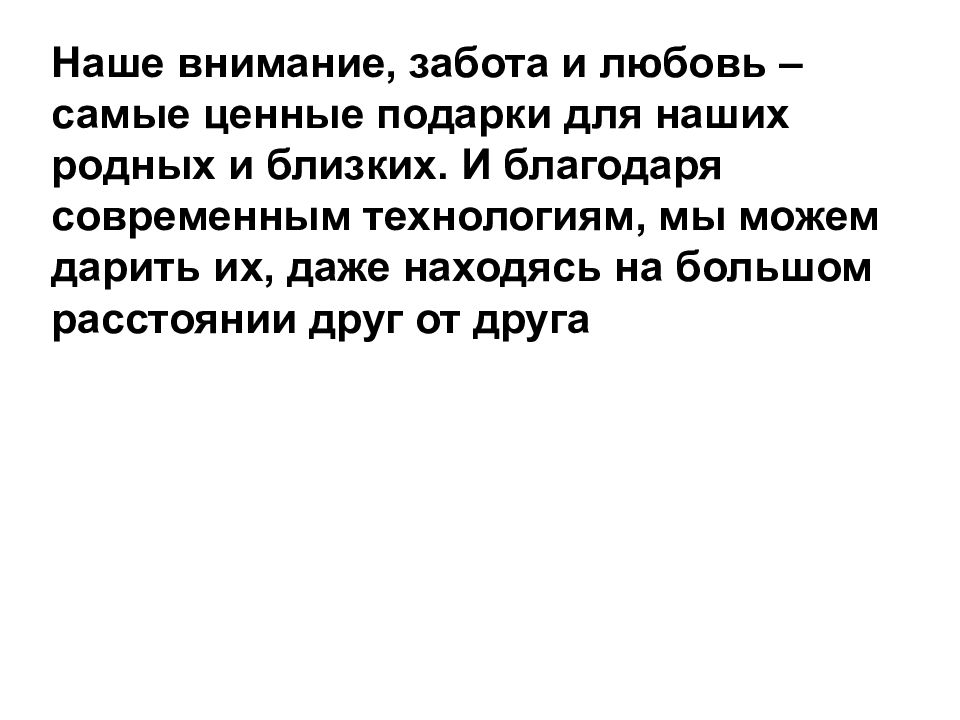 Наше внимание, забота и любовь – самые ценные подарки для наших родных и близких. И благодаря современным технологиям, мы можем дарить их, даже находясь на большом расстоянии друг от друга