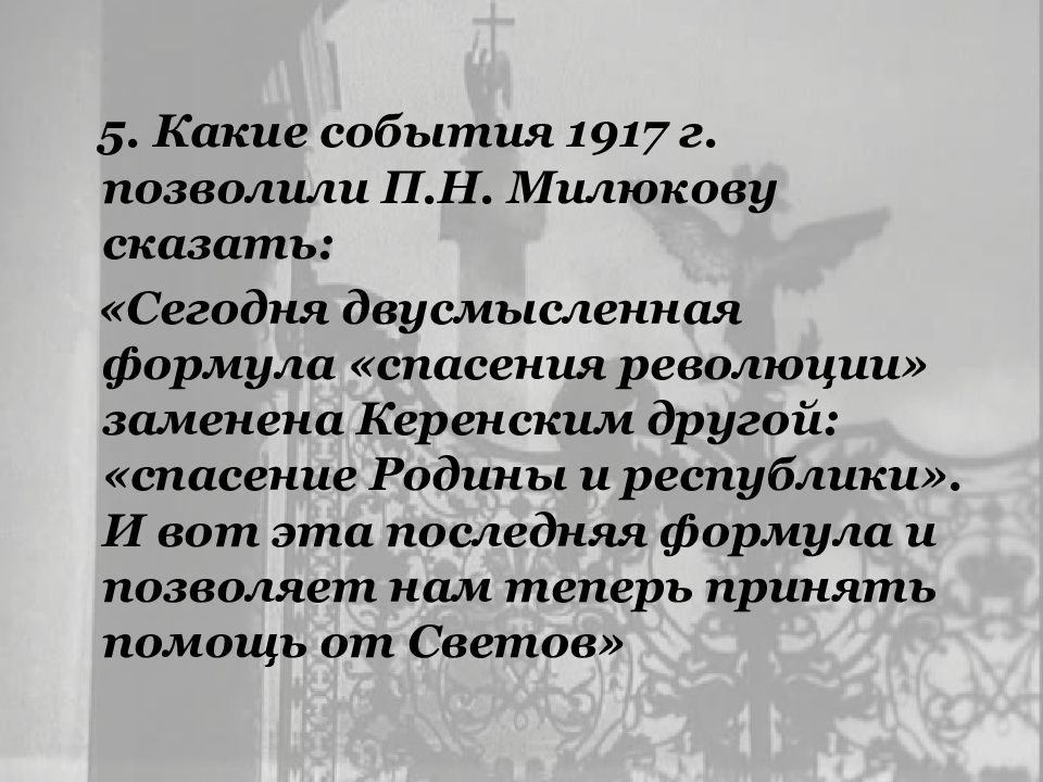5. Какие события 1917 г. позволили П.Н. Милюкову сказать: «Сегодня двусмысленная формула «спасения революции» заменена Керенским другой: «спасение Родины и республики». И вот эта последняя формула и позволяет нам теперь принять помощь от Светов»