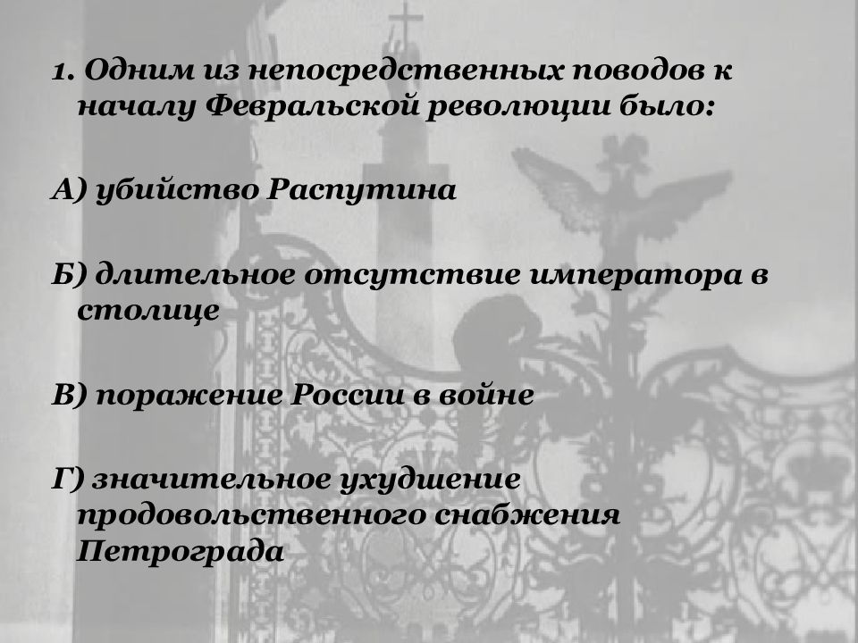 1. Одним из непосредственных поводов к началу Февральской революции было: А) убийство Распутина Б) длительное отсутствие императора в столице В) поражение России в войне Г) значительное ухудшение продовольственного снабжения Петрограда