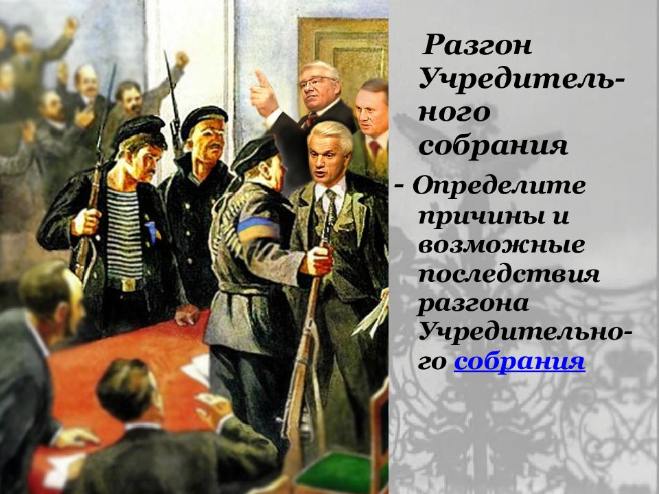 Разгон Учредитель-ного собрания - Определите причины и возможные последствия разгона Учредительно-го собрания