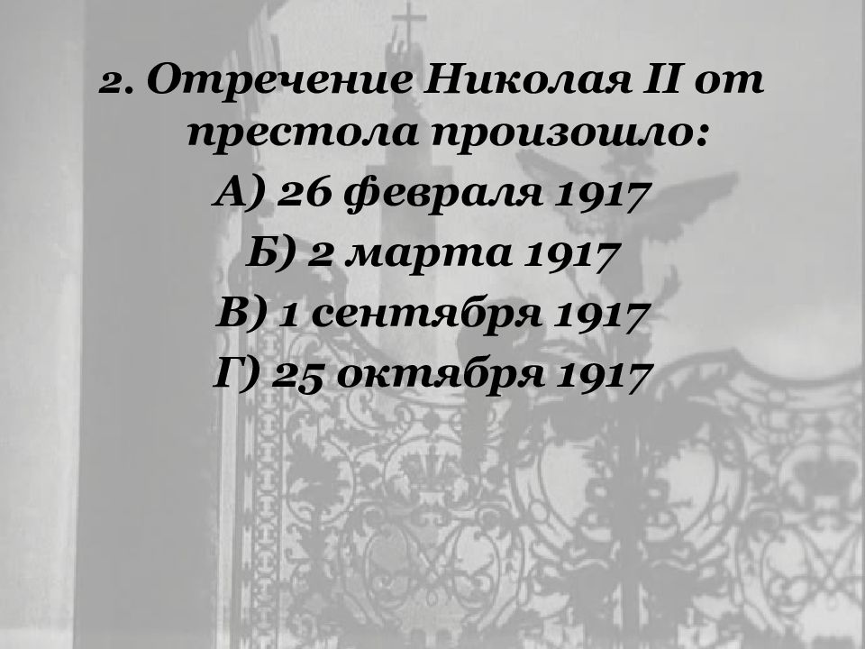 2. Отречение Николая II от престола произошло : А) 26 февраля 1917 Б) 2 марта 1917 В) 1 сентября 1917 Г) 25 октября 1917