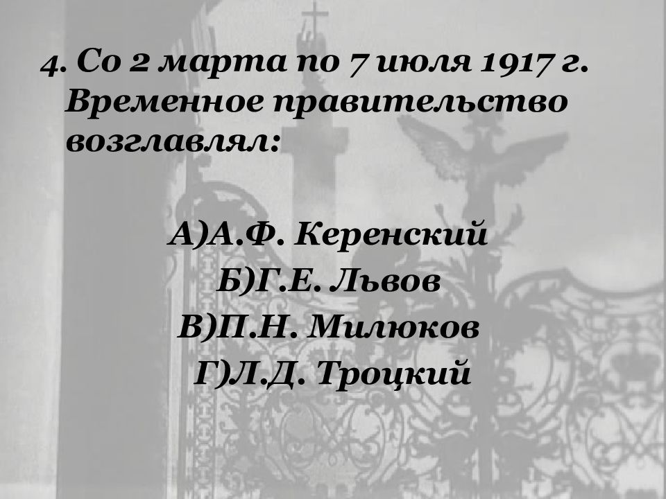 4. Со 2 марта по 7 июля 1917 г. Временное правительство возглавлял: А)А.Ф. Керенский Б)Г.Е. Львов В)П.Н. Милюков Г)Л.Д. Троцкий