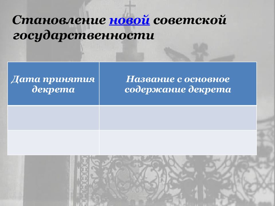 Становление новой советской государственности Дата принятия декрета Название с основное содержание декрета
