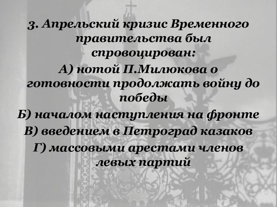 3. Апрельский кризис Временного правительства был спровоцирован: А ) нотой П.Милюкова о готовности продолжать войну до победы Б ) началом наступления на фронте В ) введением в Петроград казаков Г ) массовыми арестами членов левых партий