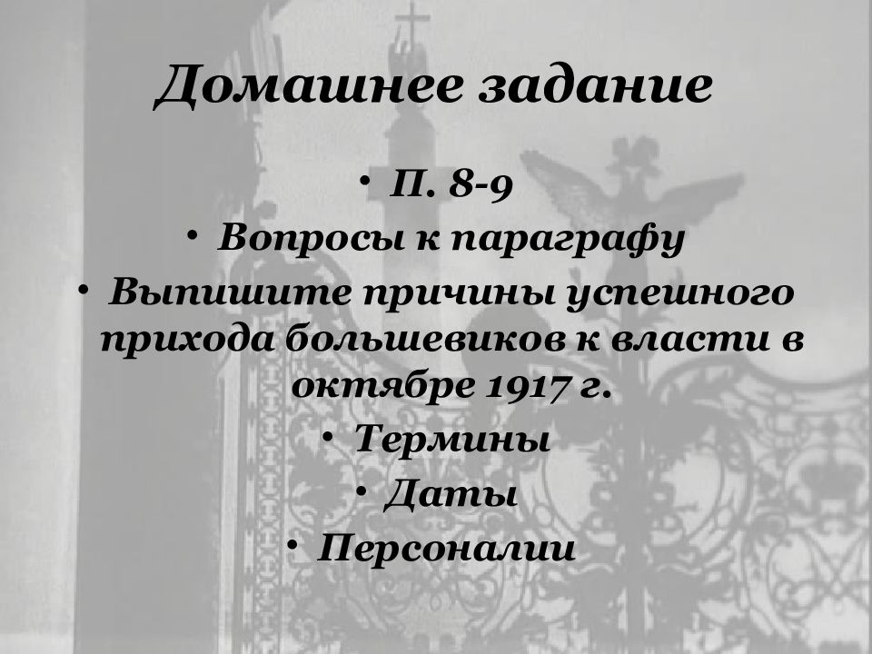 П. 8-9 Вопросы к параграфу Выпишите причины успешного прихода большевиков к власти в октябре 1917 г. Термины Даты Персоналии