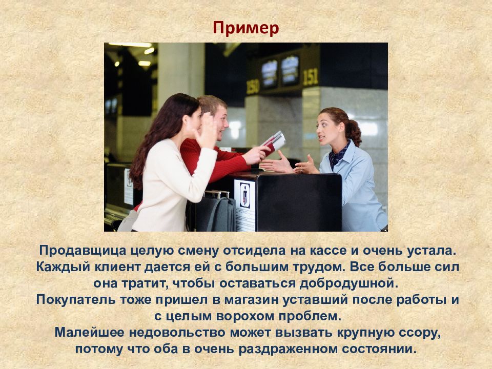 Пример Продавщица целую смену отсидела на кассе и очень устала. Каждый клиент дается ей с большим трудом. Все больше сил она тратит, чтобы оставаться добродушной. Покупатель тоже пришел в магазин уставший после работы и с целым ворохом проблем. Малейшее недовольство может вызвать крупную ссору, потому что оба в очень раздраженном состоянии.