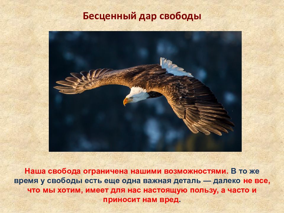 Бесценный дар свободы Наша свобода ограничена нашими возможностями. В то же время у свободы есть еще одна важная деталь — далеко не все, что мы хотим, имеет для нас настоящую пользу, а часто и приносит нам вред.
