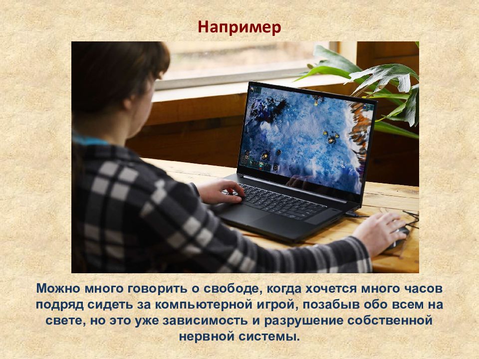 Например Можно много говорить о свободе, когда хочется много часов подряд сидеть за компьютерной игрой, позабыв обо всем на свете, но это уже зависимость и разрушение собственной нервной системы.