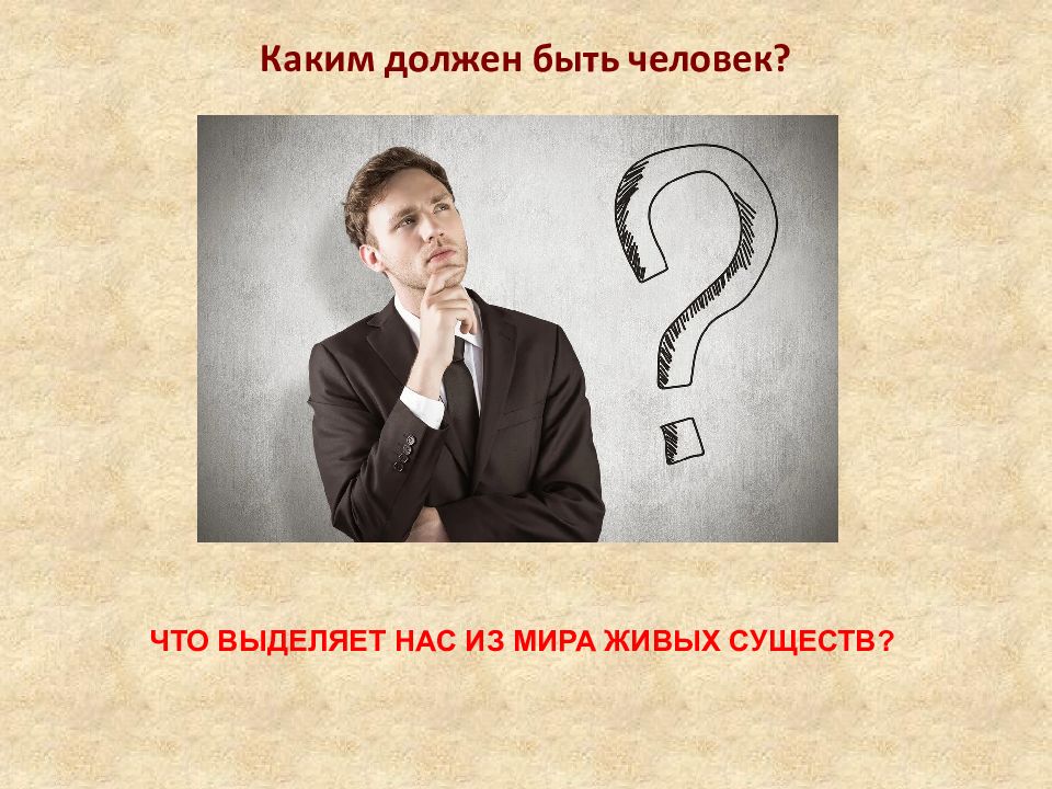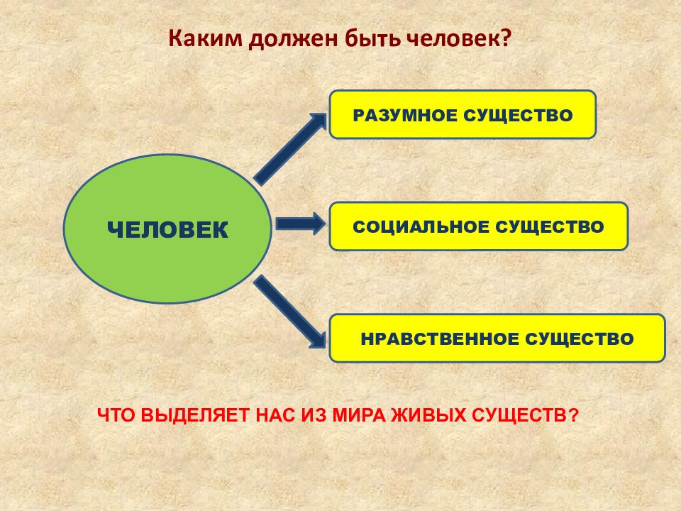 Каким должен быть человек? ЧТО ВЫДЕЛЯЕТ НАС ИЗ МИРА ЖИВЫХ СУЩЕСТВ? ЧЕЛОВЕК РАЗУМНОЕ СУЩЕСТВО СОЦИАЛЬНОЕ СУЩЕСТВО НРАВСТВЕННОЕ СУЩЕСТВО