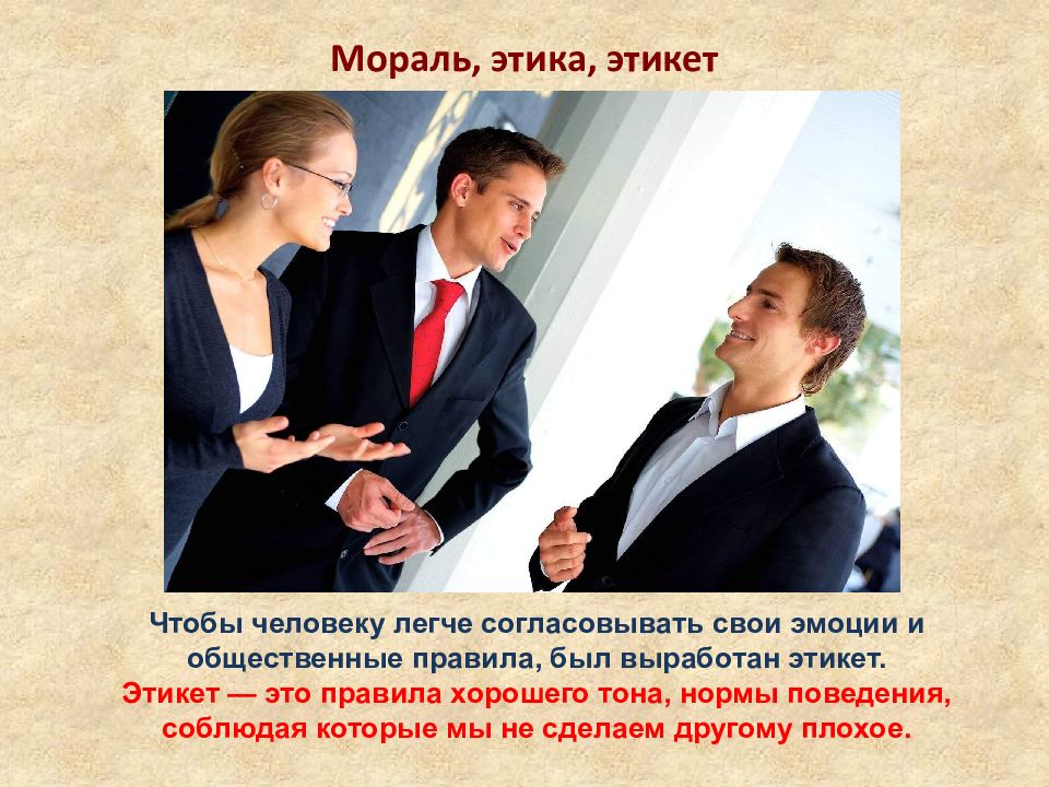 Мораль, этика, этикет Чтобы человеку легче согласовывать свои эмоции и общественные правила, был выработан этикет. Этикет — это правила хорошего тона, нормы поведения, соблюдая которые мы не сделаем другому плохое.