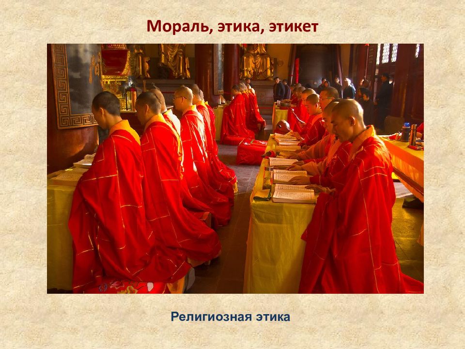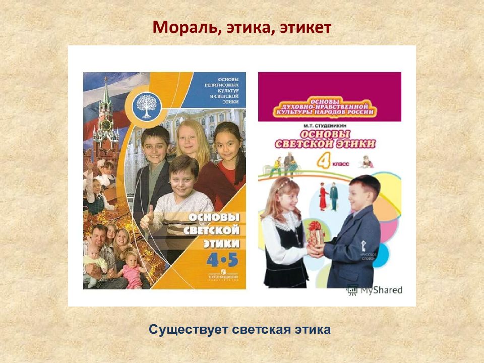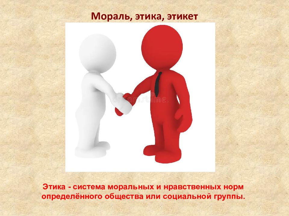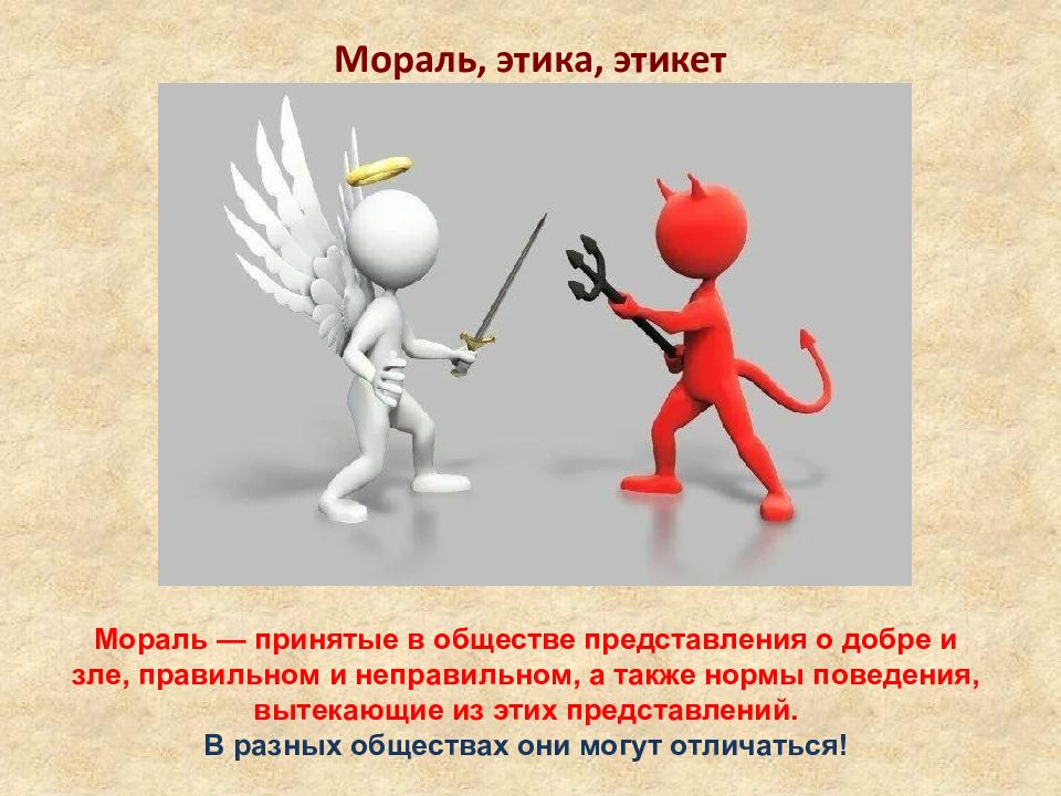 Мораль, этика, этикет Мораль — принятые в обществе представления о добре и зле, правильном и неправильном, а также нормы поведения, вытекающие из этих представлений. В разных обществах они могут отличаться!