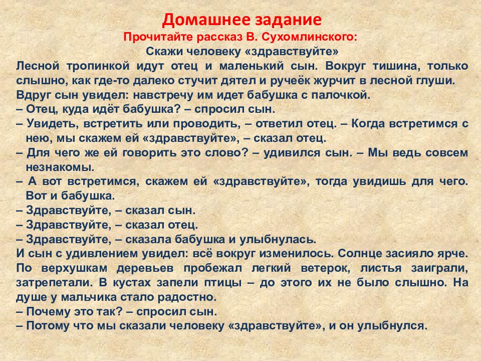 Домашнее задание Прочитайте рассказ В. Сухомлинского: Скажи человеку «здравствуйте» Лесной тропинкой идут отец и маленький сын. Вокруг тишина, только слышно, как где-то далеко стучит дятел и ручеёк журчит в лесной глуши. Вдруг сын увидел: навстречу им идет бабушка с палочкой. – Отец, куда идёт бабушка? – спросил сын. – Увидеть, встретить или проводить, – ответил отец. – Когда встретимся с нею, мы скажем ей «здравствуйте», – сказал отец. – Для чего же ей говорить это слово? – удивился сын. – Мы ведь совсем незнакомы. – А вот встретимся, скажем ей «здравствуйте», тогда увидишь для чего. Вот и бабушка. – Здравствуйте, – сказал сын. – Здравствуйте, – сказал отец. – Здравствуйте, – сказала бабушка и улыбнулась. И сын с удивлением увидел: всё вокруг изменилось. Солнце засияло ярче. По верхушкам деревьев пробежал легкий ветерок, листья заиграли, затрепетали. В кустах запели птицы – до этого их не было слышно. На душе у мальчика стало радостно. – Почему это так? – спросил сын. – Потому что мы сказали человеку «здравствуйте», и он улыбнулся.