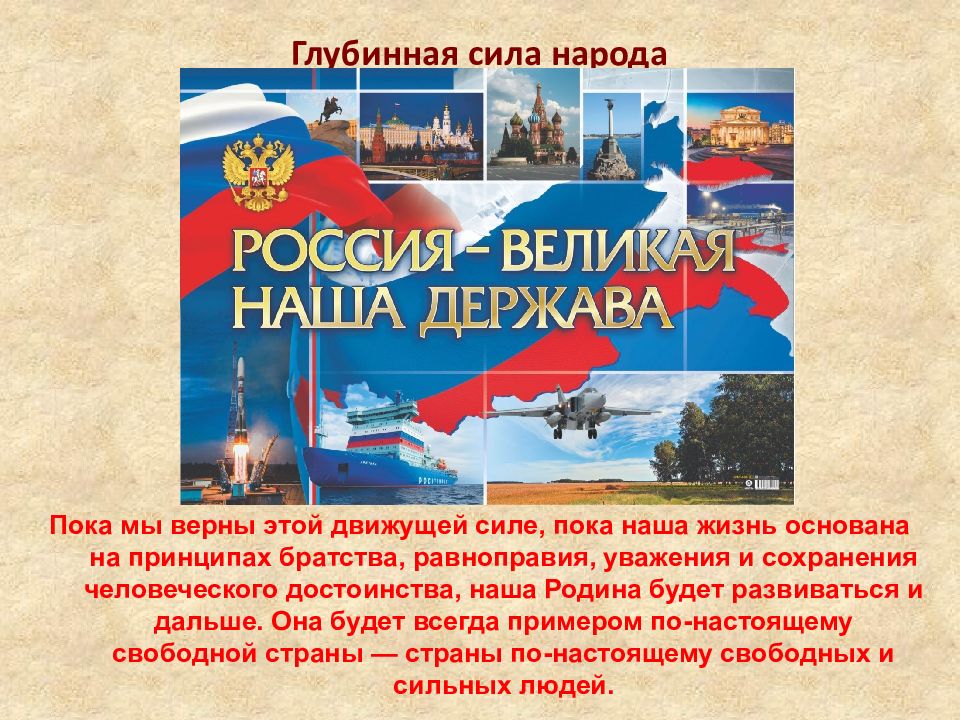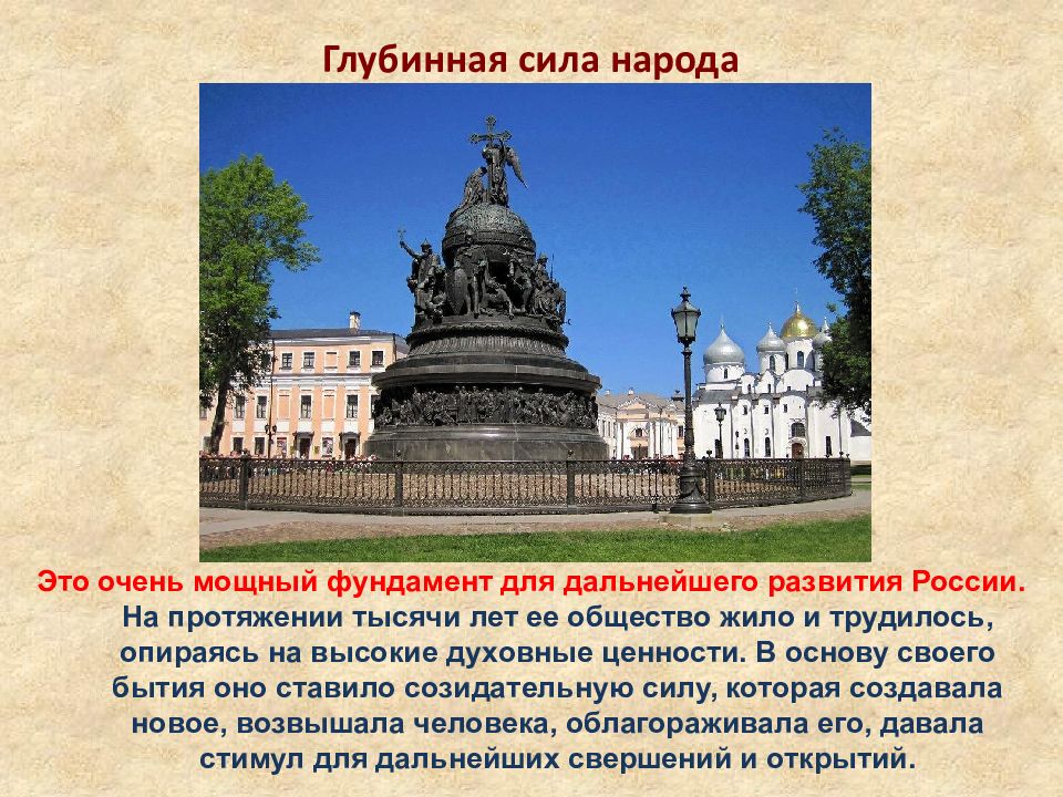 Глубинная сила народа Это очень мощный фундамент для дальнейшего развития России. На протяжении тысячи лет ее общество жило и трудилось, опираясь на высокие духовные ценности. В основу своего бытия оно ставило созидательную силу, которая создавала новое, возвышала человека, облагораживала его, давала стимул для дальнейших свершений и открытий.