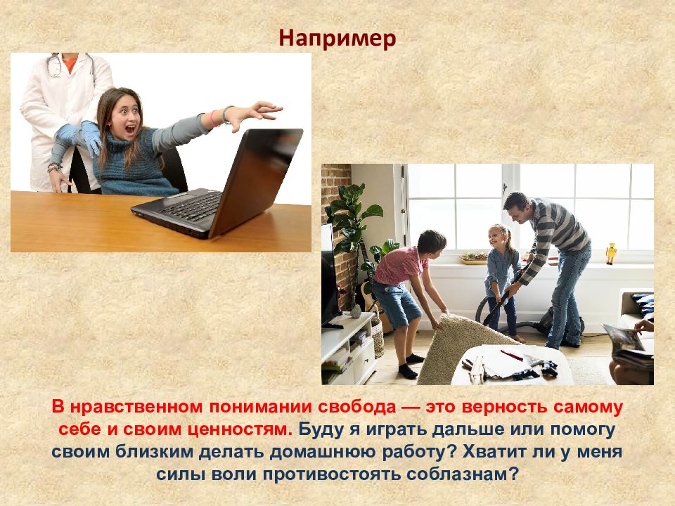 Например В нравственном понимании свобода — это верность самому себе и своим ценностям. Буду я играть дальше или помогу своим близким делать домашнюю работу? Хватит ли у меня силы воли противостоять соблазнам?